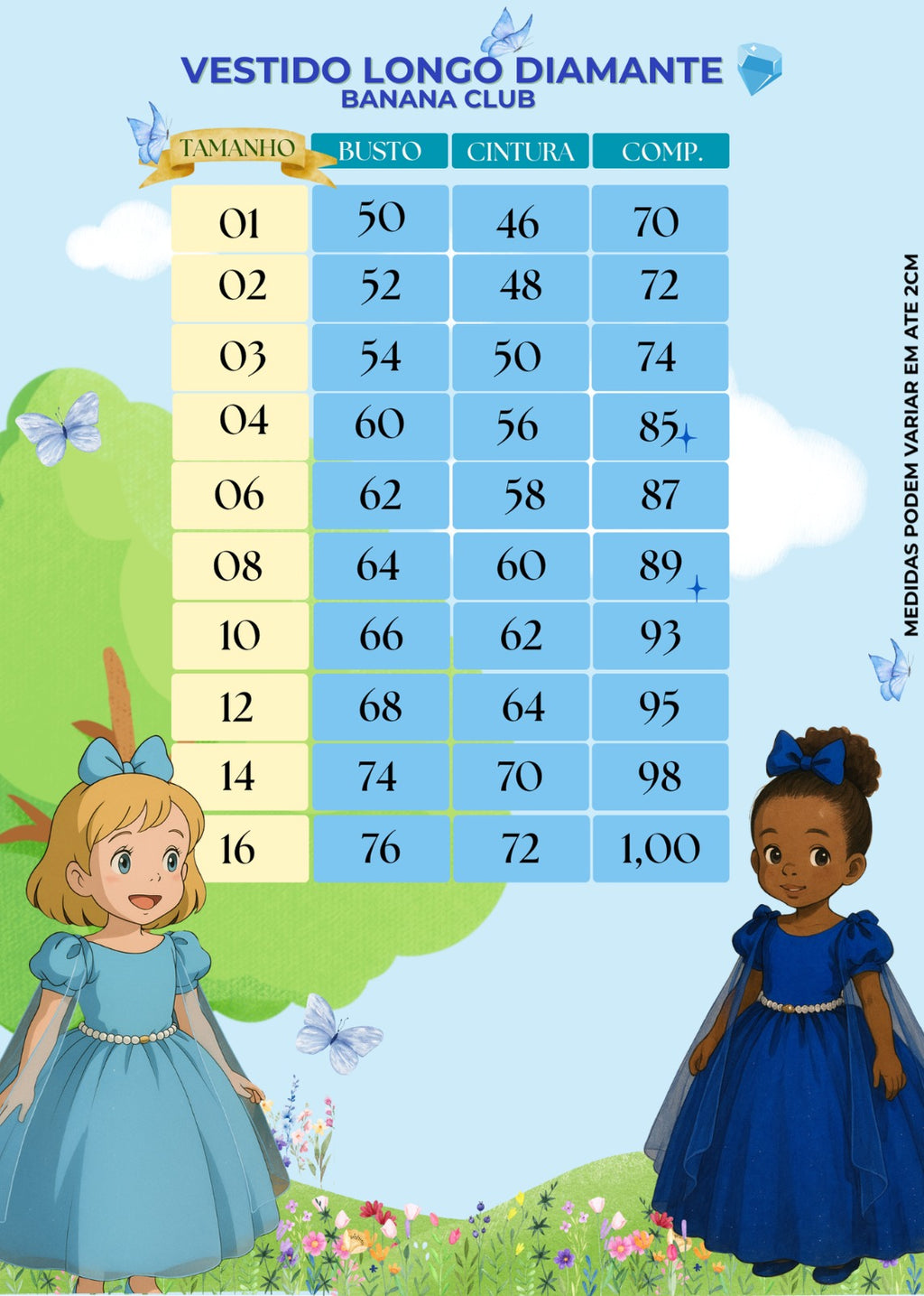 • As medidas podem variar em até 2cm. Recomendamos sempre consultar a tabela de medidas antes da compra para evitar erros.